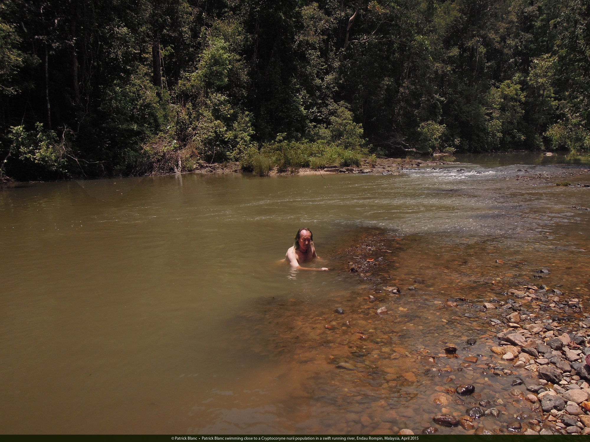 Patrick Blanc swimming close to a Cryptocoryne nurii population in a swift running river, Endau Rompin, Malaysia, April 2015