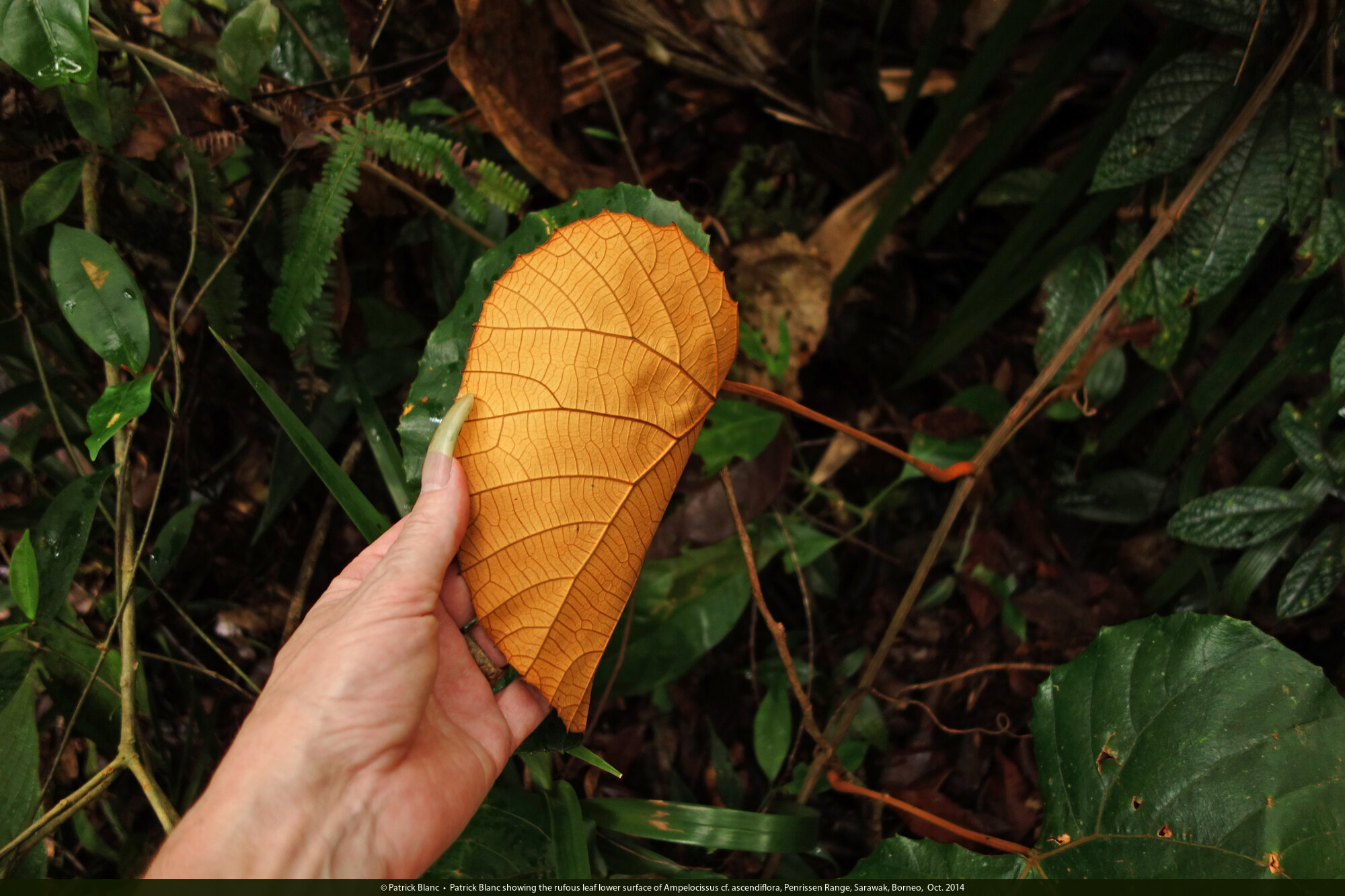 Patrick Blanc showing the rufous leaf lower surface of Ampelocissus cf. ascendiflora, Penrissen Range, Sarawak, Borneo, Oct. 2014