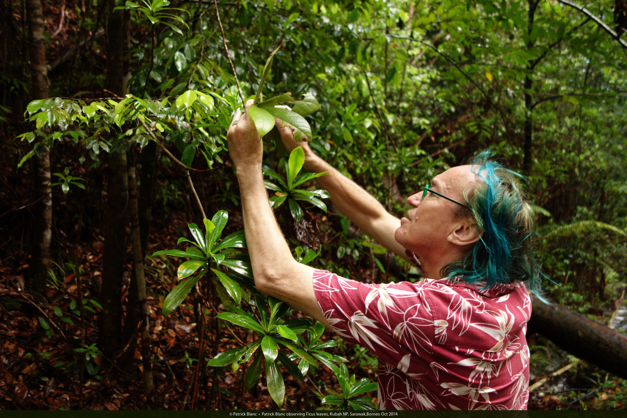 Patrick Blanc observing Ficus leaves, Kubah NP, Sarawak,Borneo Oct 2014