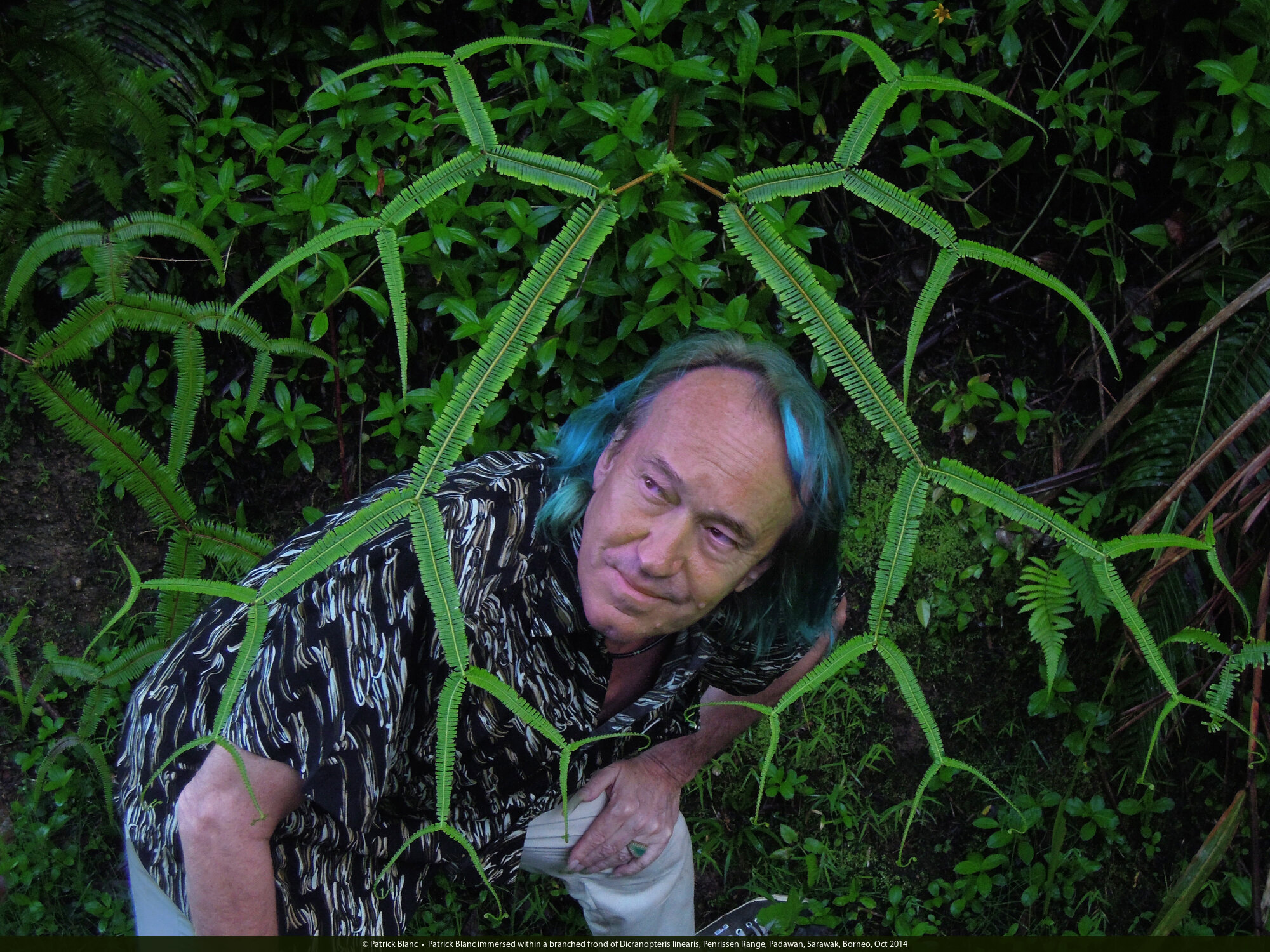 Patrick Blanc immersed within a branched frond of Dicranopteris linearis, Penrissen Range, Padawan, Sarawak, Borneo, Oct 2014