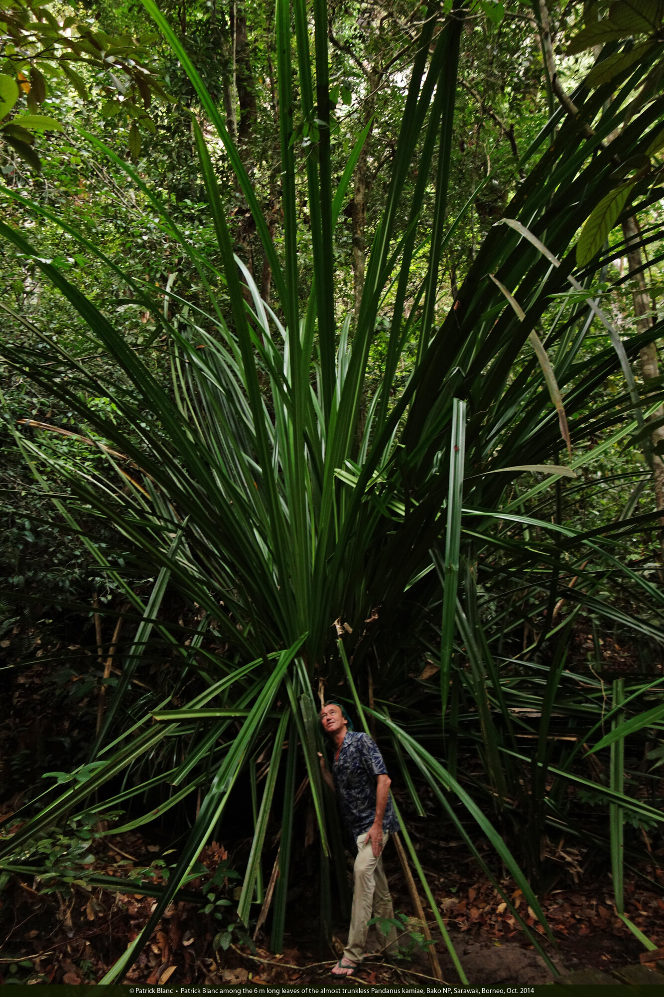 Patrick Blanc among the 6 m long leaves of the almost trunkless Pandanus kamiae, Bako NP, Sarawak, Borneo, Oct. 2014