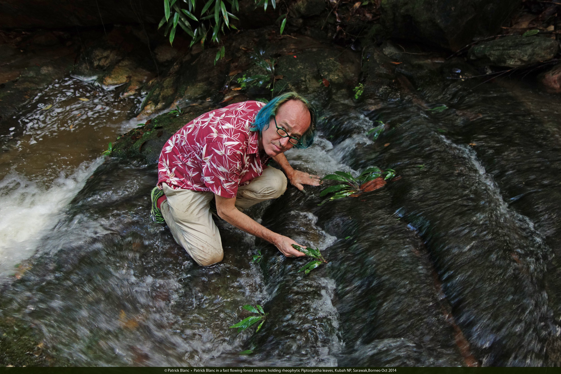 Patrick Blanc in a fast flowing forest stream, holding rheophytic Piptospatha leaves, Kubah NP, Sarawak,Borneo Oct 2014