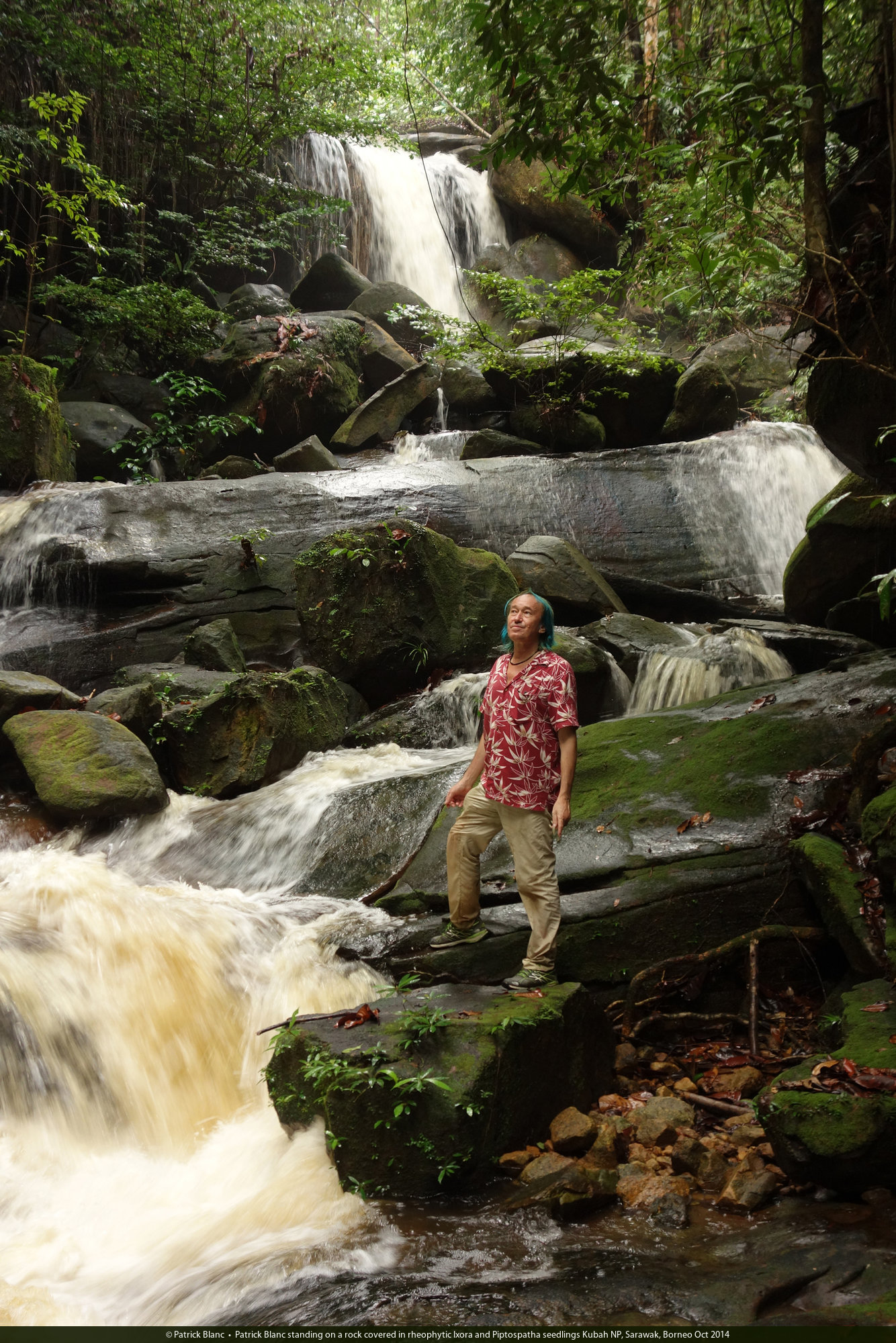Patrick Blanc standing on a rock covered in rheophytic Ixora and Piptospatha seedlings Kubah NP, Sarawak, Borneo Oct 2014