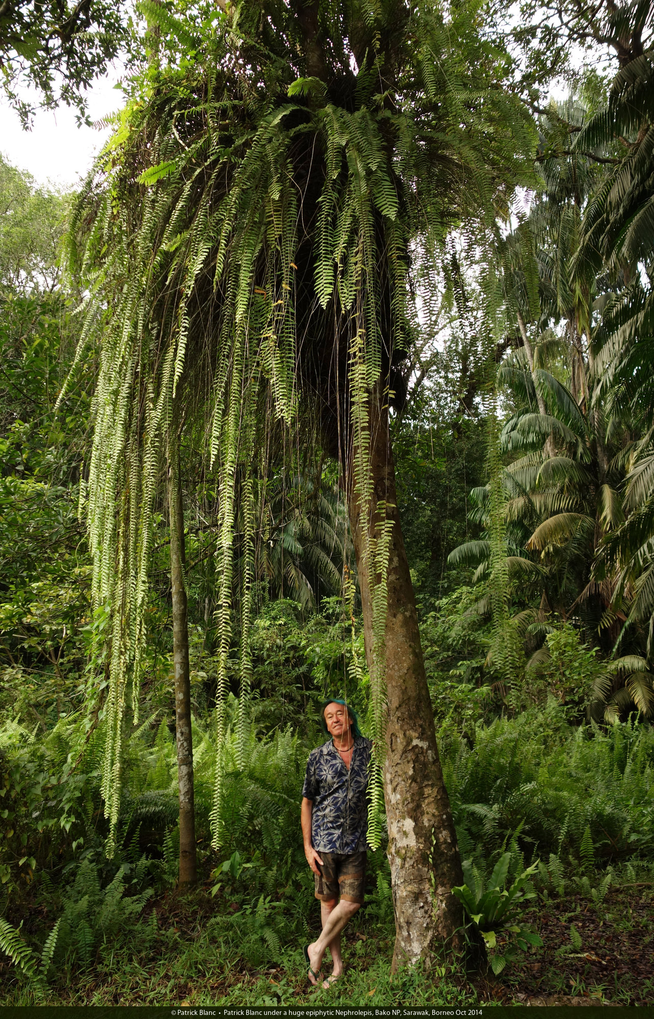 Patrick Blanc under a huge epiphytic Nephrolepis, Bako NP, Sarawak, Borneo Oct 2014