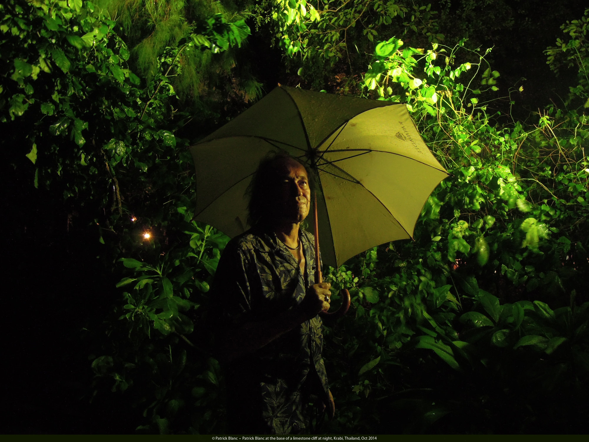 Patrick Blanc at the base of a limestone cliff at night, Krabi, Thailand, Oct 2014
