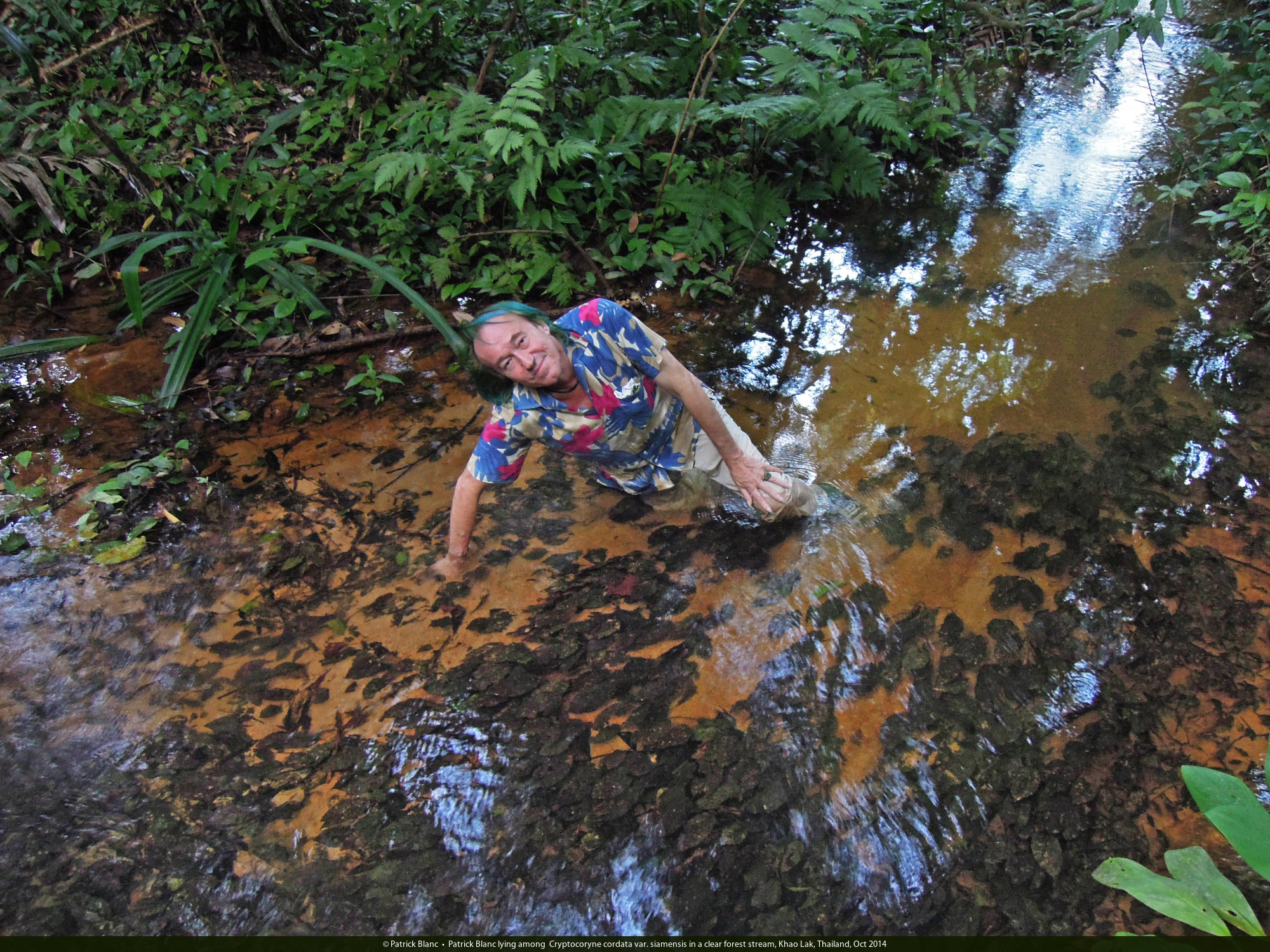 Patrick Blanc lying among Cryptocoryne cordata var. siamensis in a clear forest stream, Khao Lak, Thailand, Oct 2014