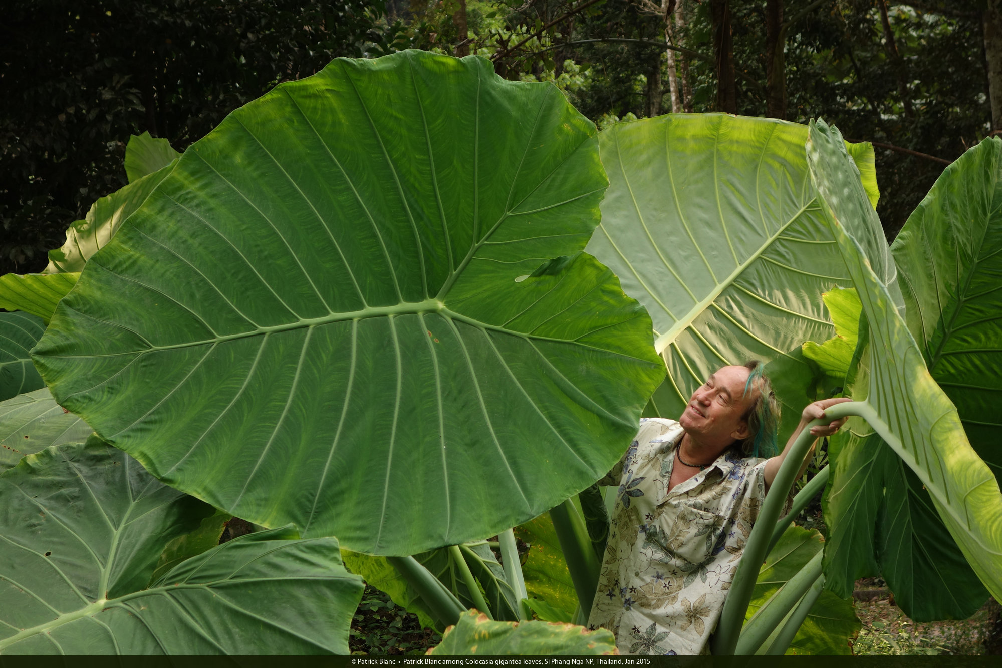 Patrick Blanc among Colocasia gigantea leaves, Si Phang Nga NP, Thailand, Jan 2015