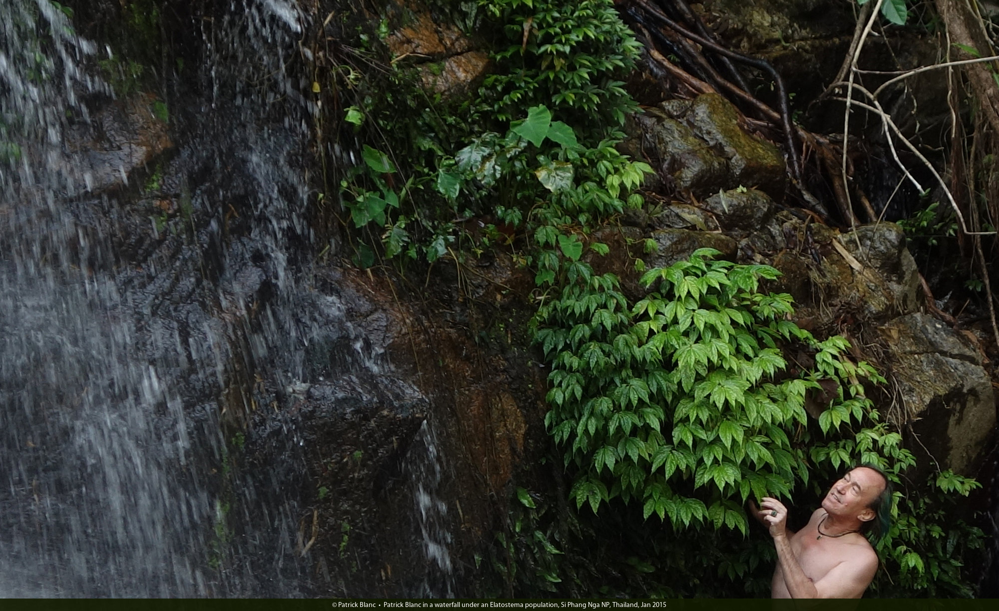 Patrick Blanc in a waterfall under an Elatostema population, Si Phang Nga NP, Thailand, Jan 2015