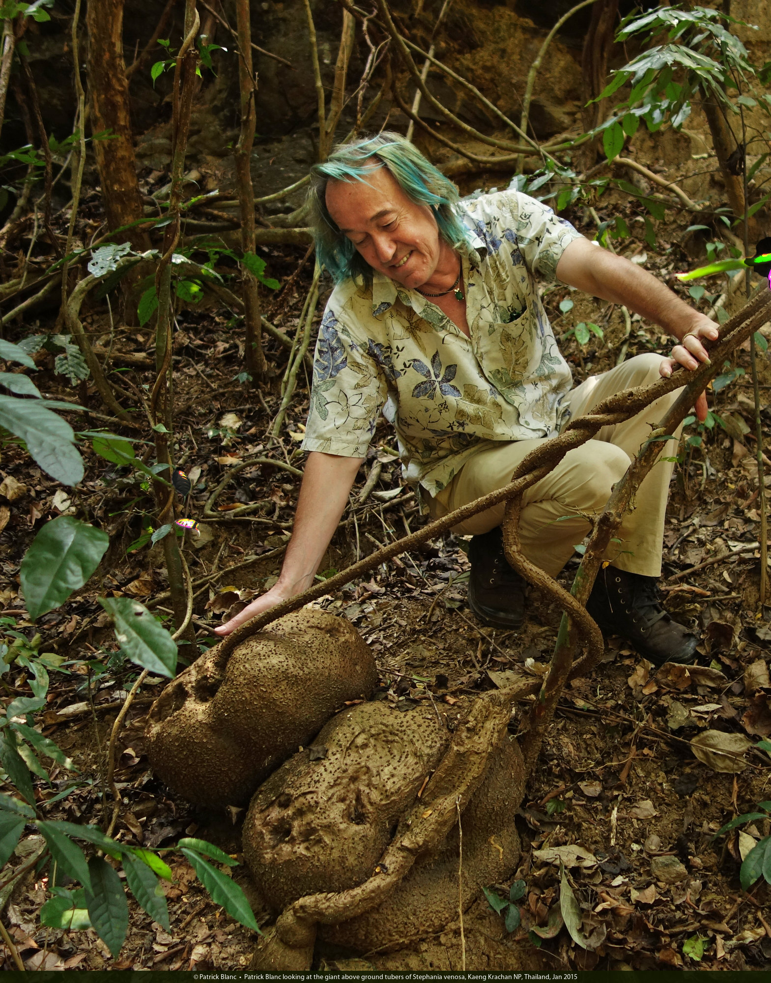 Patrick Blanc looking at the giant above ground tubers of Stephania venosa, Kaeng Krachan NP, Thailand, Jan 2015
