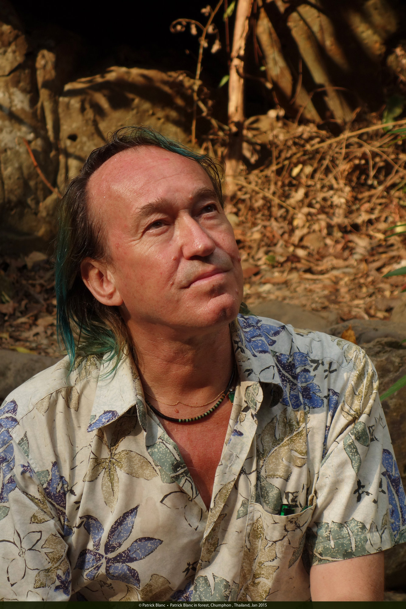 Patrick Blanc looking at forest canopy, Chumphon , Thailand, Jan 2015