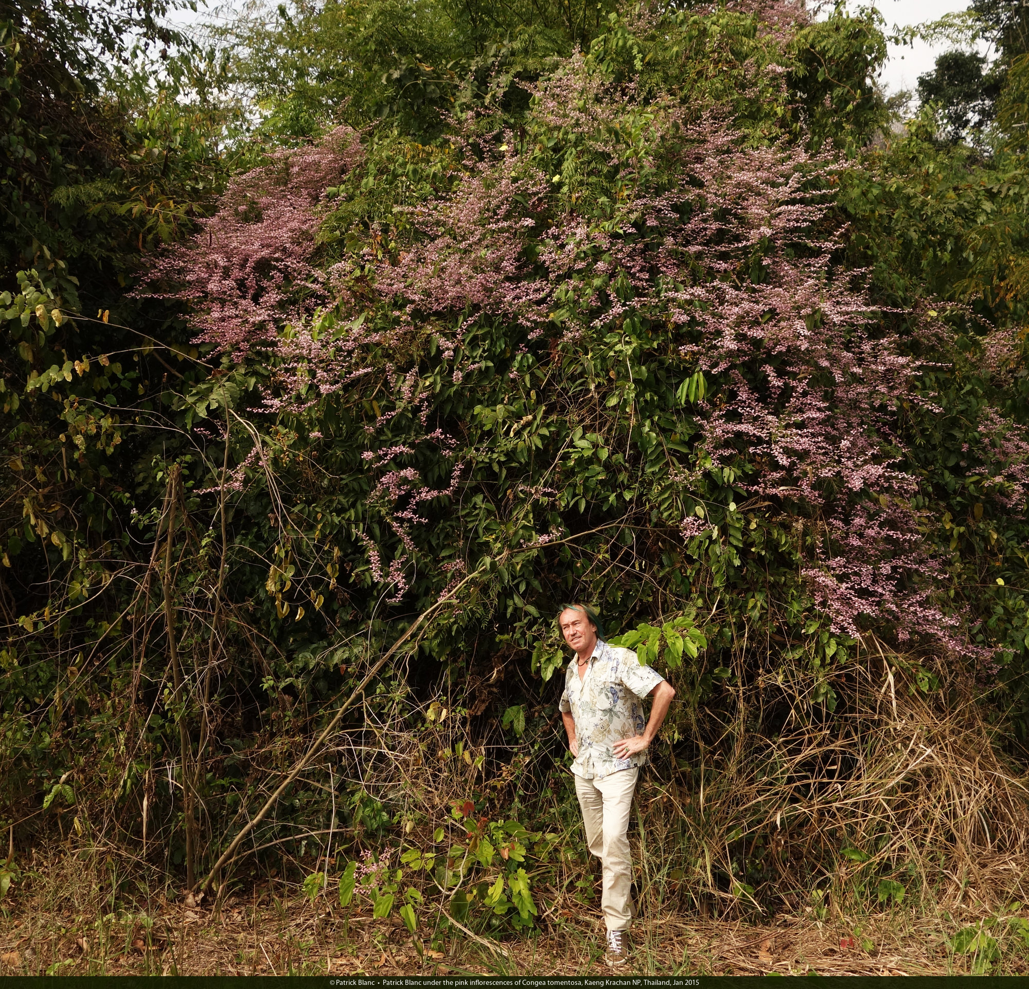 Patrick Blanc under the pink inflorescences of Congea tomentosa, Kaeng Krachan NP, Thailand, Jan 2015