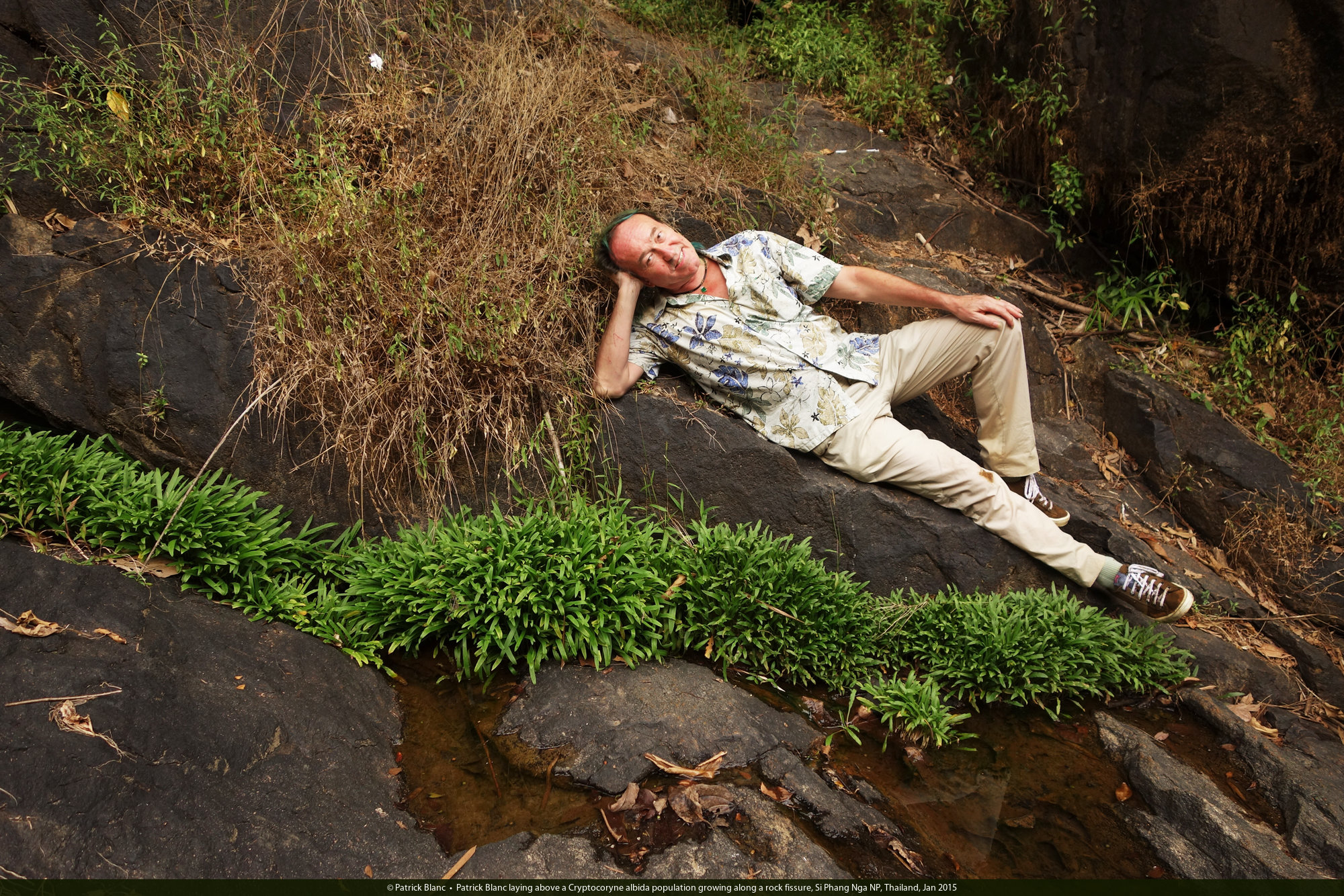 Patrick Blanc laying above a Cryptocoryne albida population growing along a rock fissure, Si Phang Nga NP, Thailand, Jan 2015