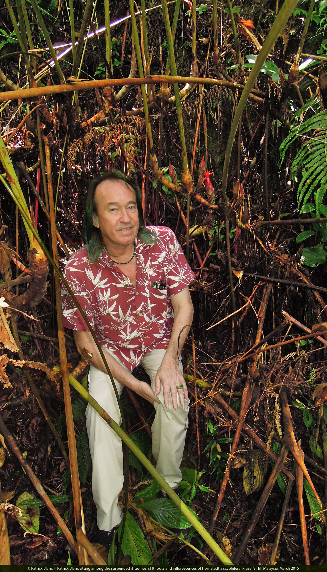 Patrick Blanc sitting among the suspended rhizomes, stilt roots and inflorescences of Hornstedtia scyphifera, Fraser's Hill, Malaysia, March 2015