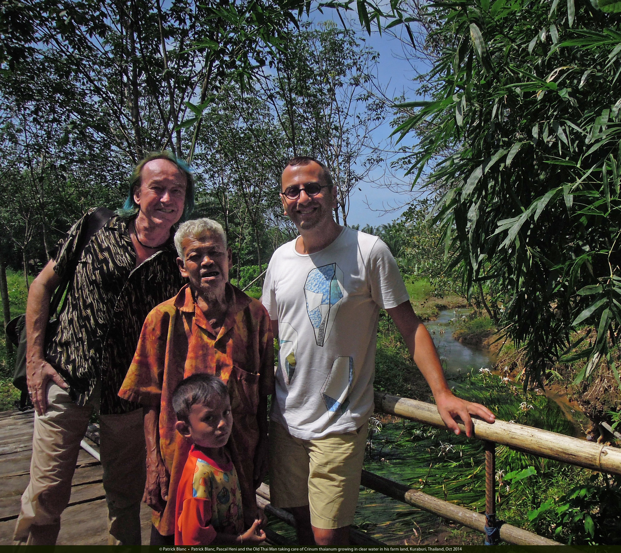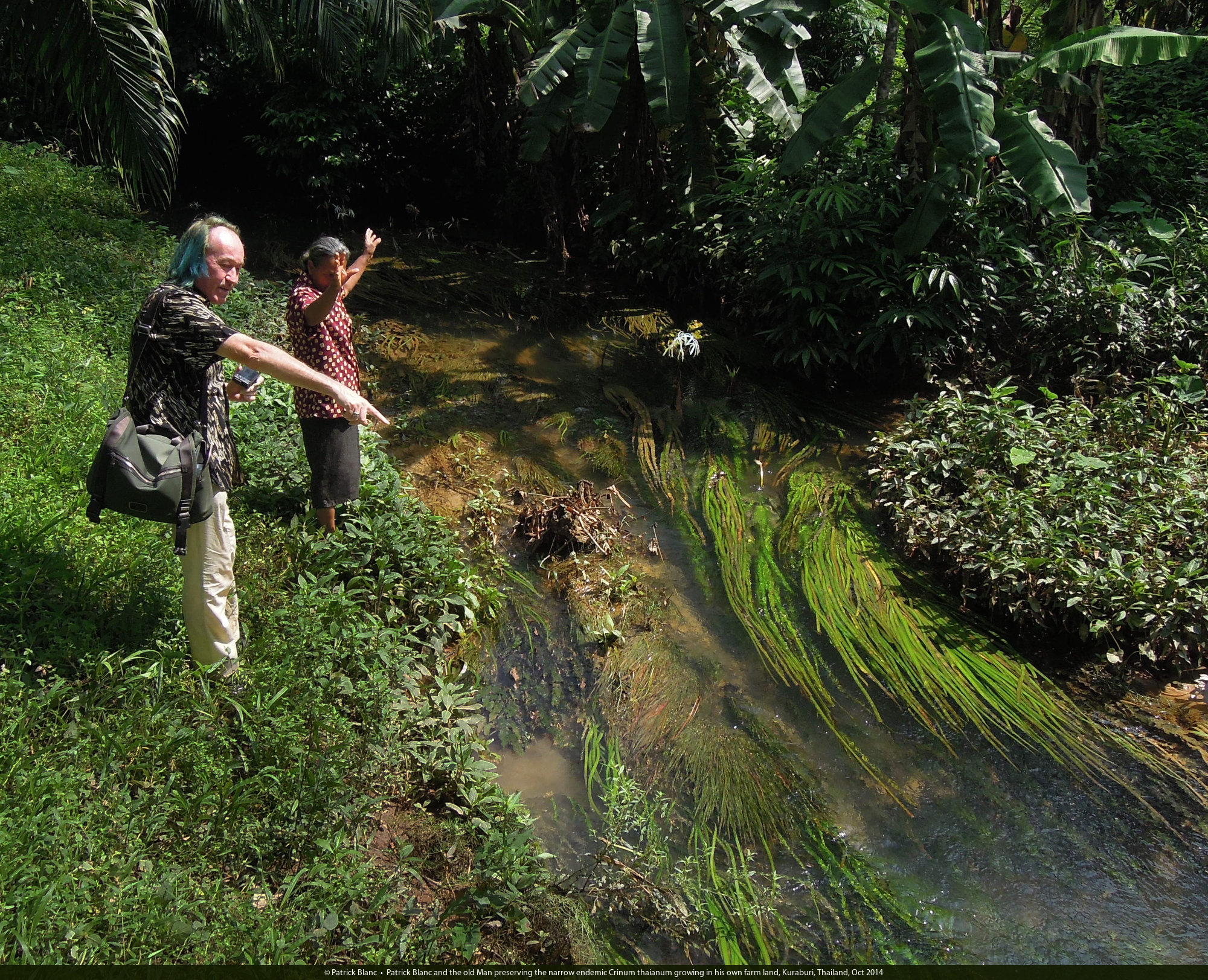 Patrick Blanc, Pascal Heni and the Old Thai Man taking care of Crinum thaianum growing in clear water in his farm land, Kuraburi, Thailand, Oct 2014