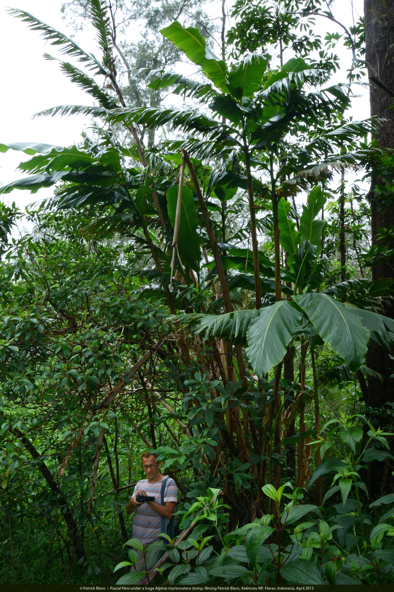 Pascal Heni under a huge Alpinia myriocratera clump, filming Patrick Blanc, Kelimutu NP, Flores, Indonesia, April 2013