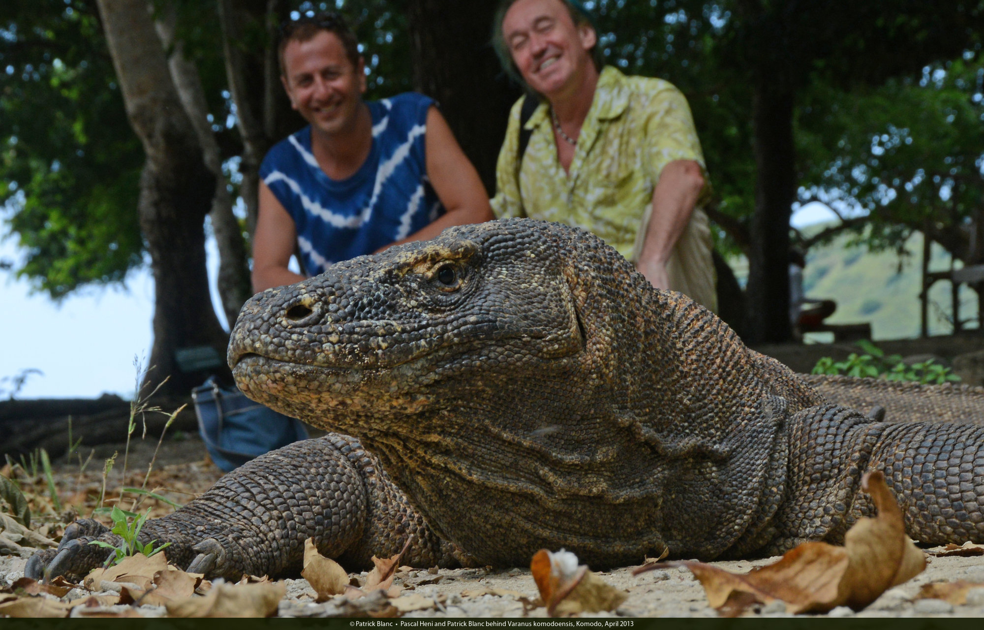 Pascal Heni and Patrick Blanc behind Varanus komodoensis, Komodo, April 2013