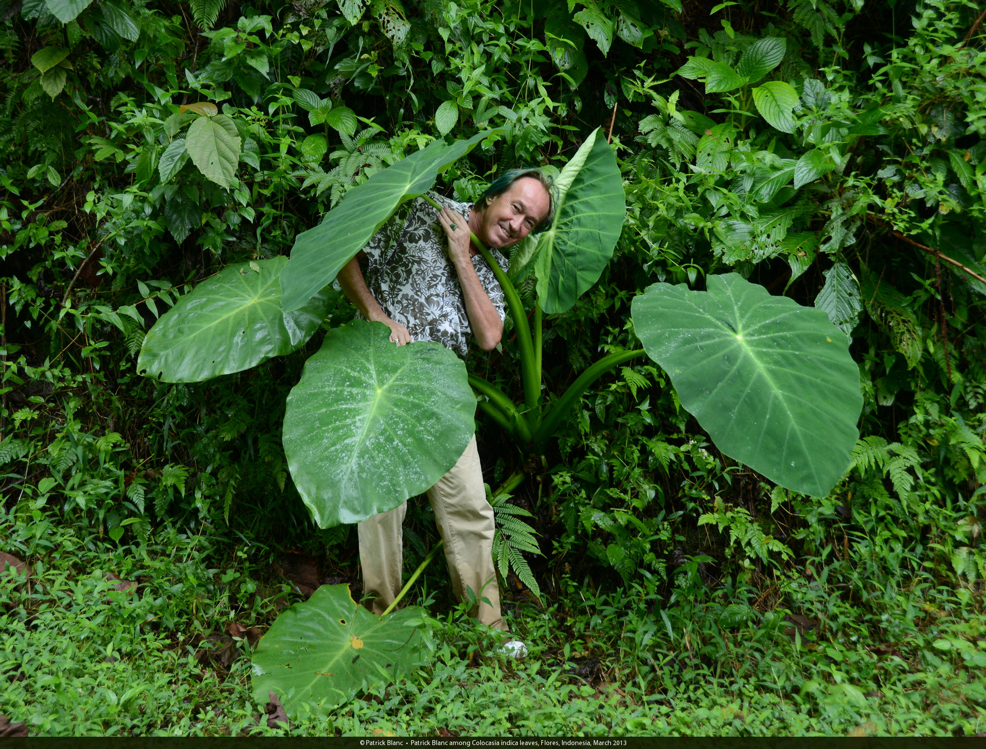 Patrick Blanc among Colocasia gigantea leaves, Flores, Indonesia, March 2013