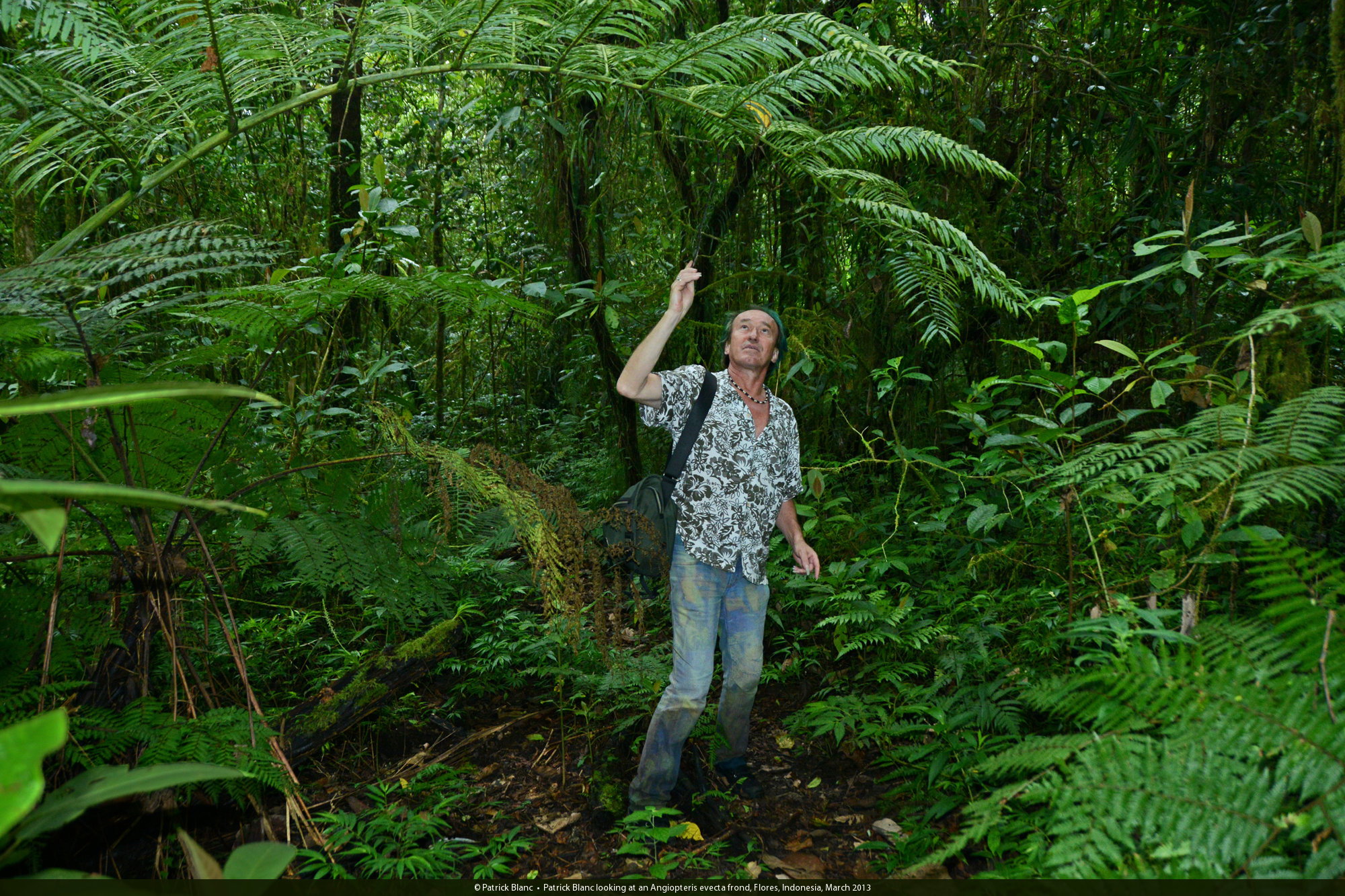 Patrick Blanc looking at an Angiopteris evecta frond, Flores, Indonesia, March 2013