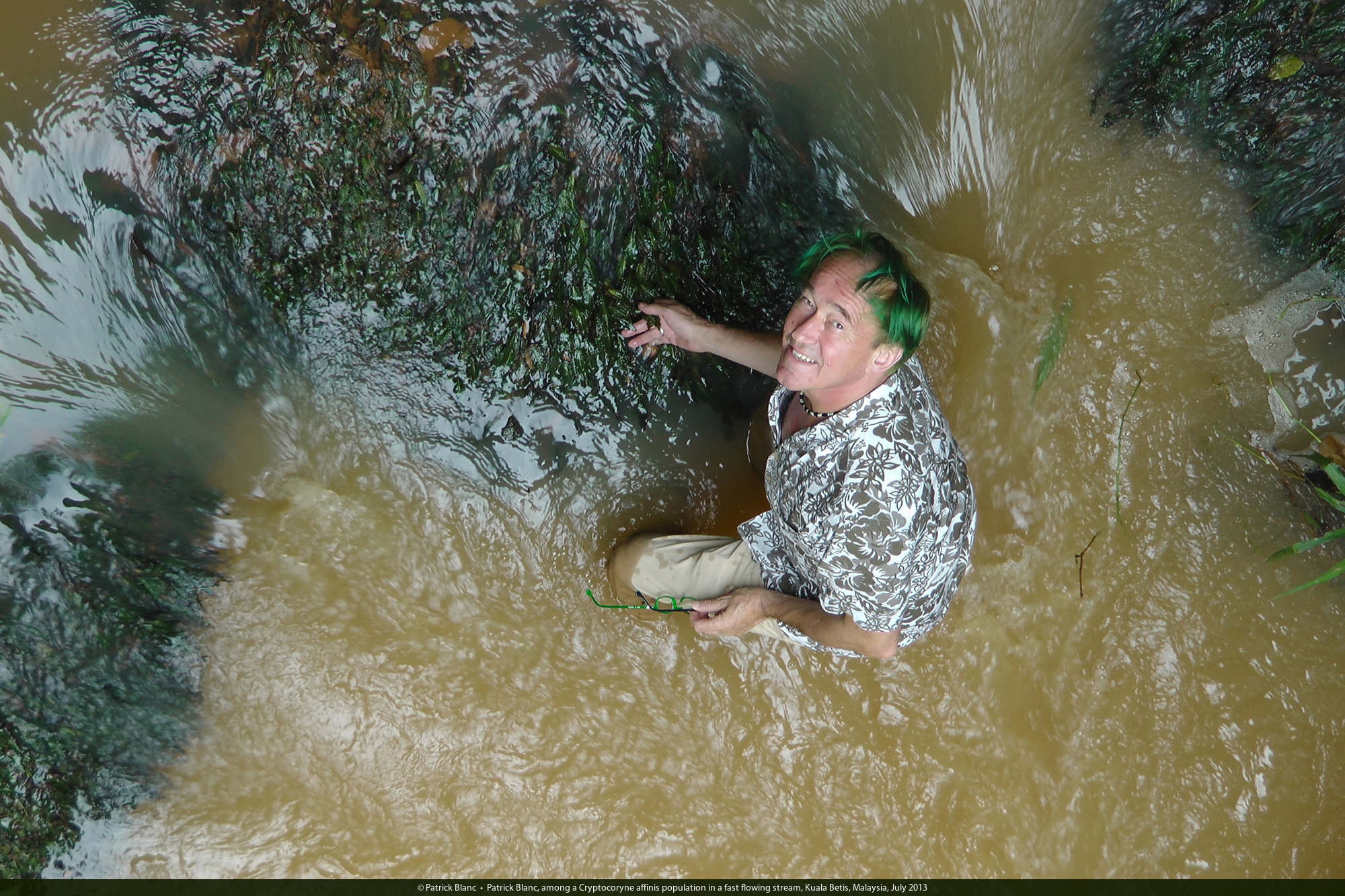 Patrick Blanc, among a Cryptocoryne affinis population in a fast flowing stream, Kuala Betis, Malaysia, July 2013