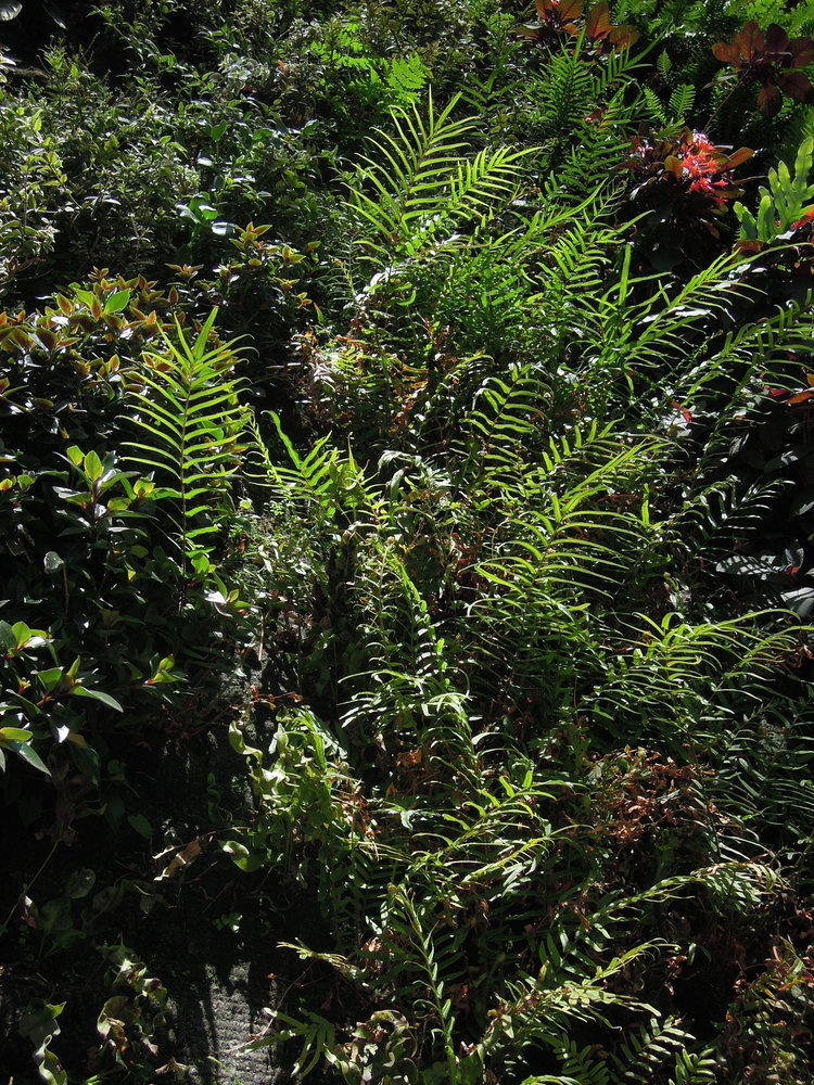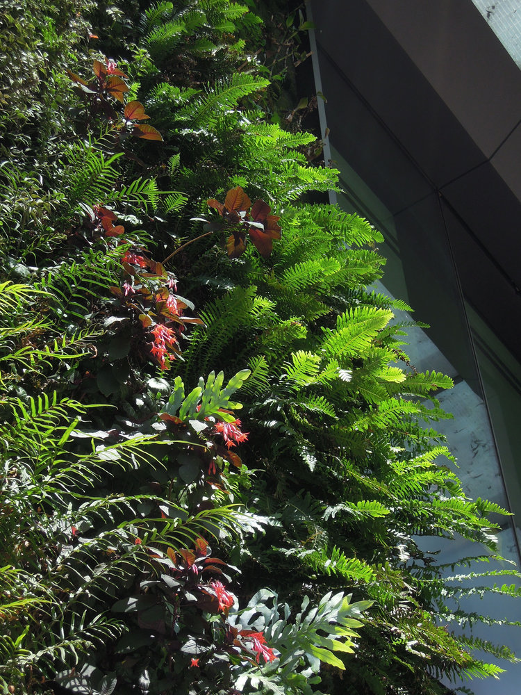 Pteris vittata, Polypodium aureum, Fuchsia cv, Blechnum nudum, One Central Park, Sydney, Oct 2014