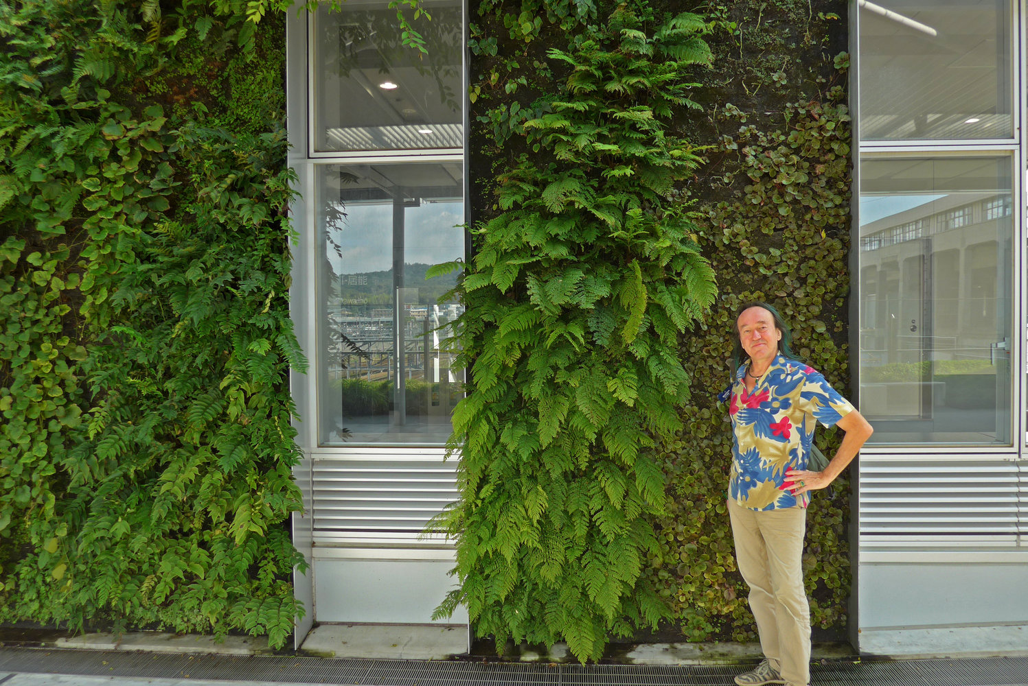 Patrick Blanc under the Iris japonica diagonale, walkway Vertical Garden, Shinkansen Yamaguchi station, Japan, Oct. 2015
